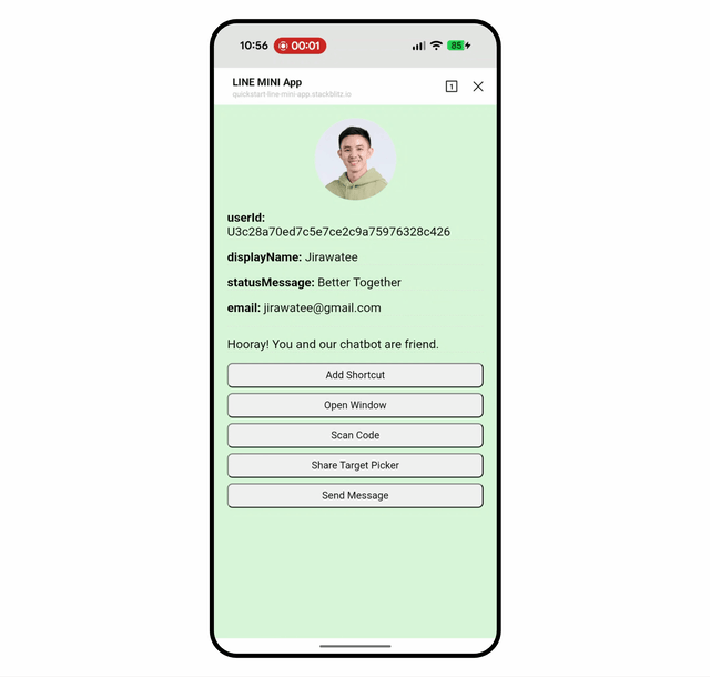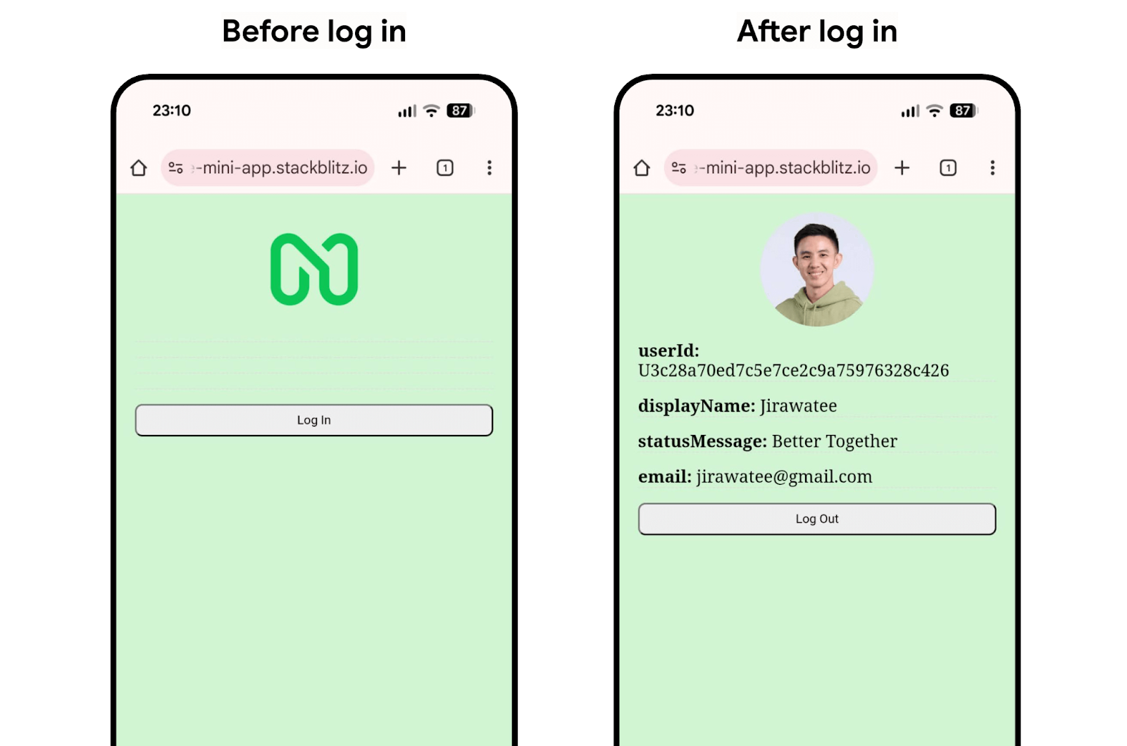 Refresh หน้า LINE MINI App บนสมาร์ทโฟนอีกครั้ง จากนั้นทดลองกดปุ่ม Log In และ Log Out