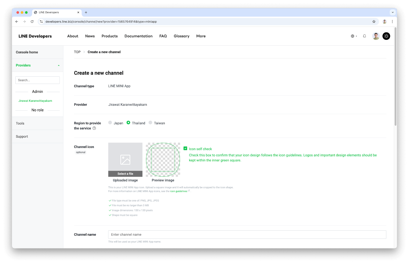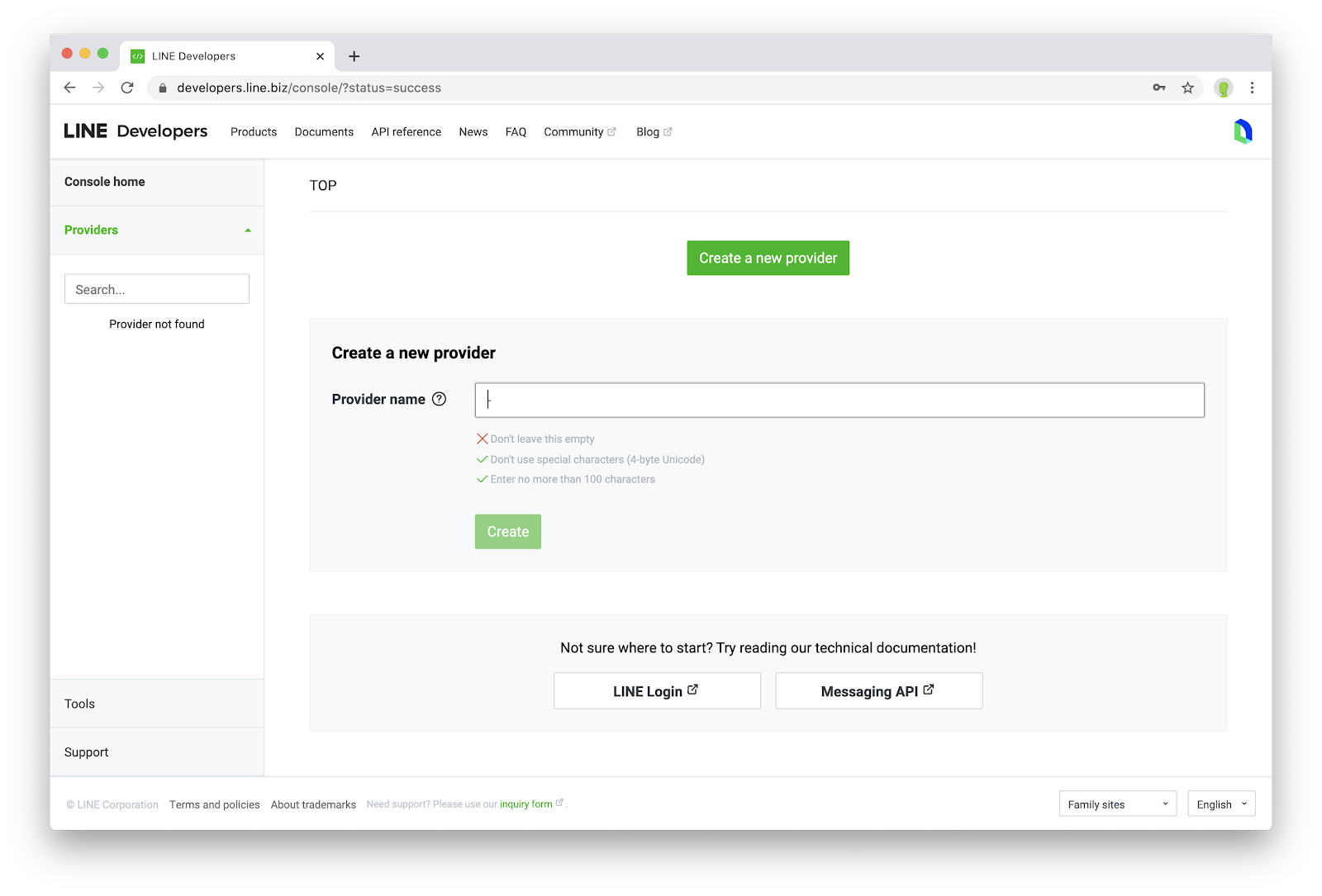 Provider คือ superset ของแอปทั้งหลายที่เราจะพัฒนาขึ้นรวมถึง LINE MINI App ด้วย โดยการสร้างเพียงให้ระบุชื่อของ Provider ลงไป ซึ่งอาจจะตั้งเป็นชื่อตัวเอง, ชื่อบริษัท, ชื่อทีม หรือชื่อกลุ่มก็ได้