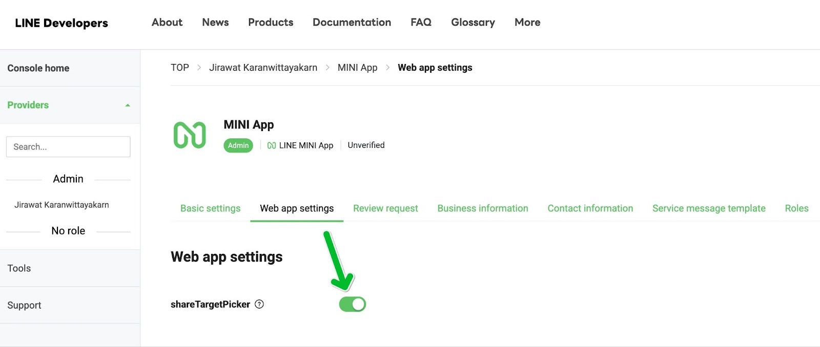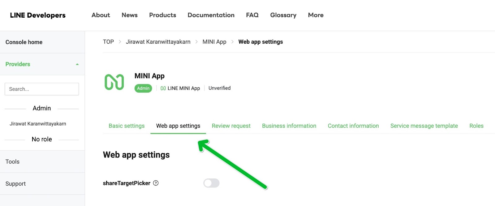 หลังจากที่คุณมี Provider และ LINE MINI App channel เรียบร้อยแล้ว ขั้นตอนต่อไปเราจะมาตั้งค่าเพื่อใช้งาน LINE MINI App กัน โดยใน channel ให้เราเลือกแท็บชื่อ Web app settings