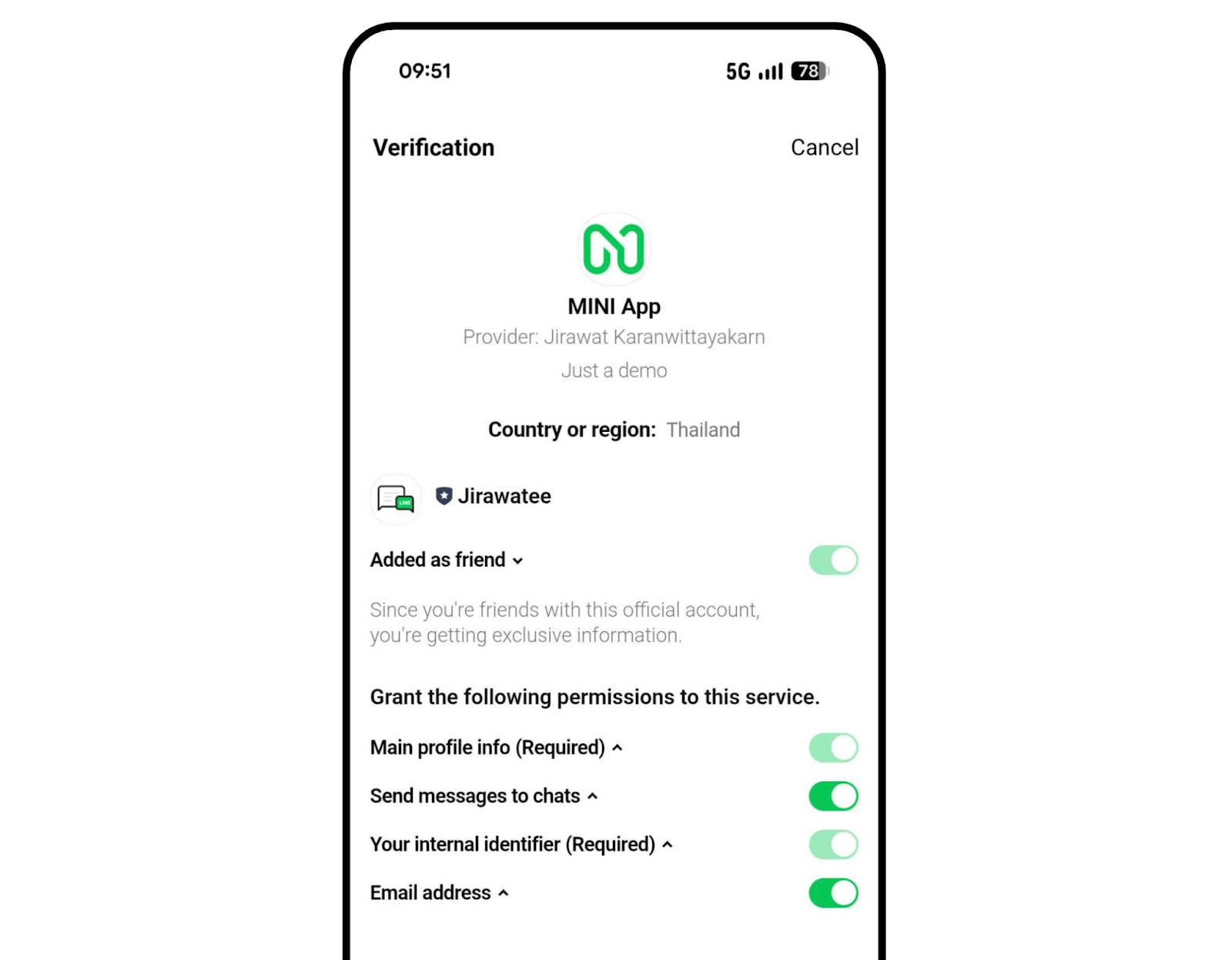 หลังจากที่เราได้เชื่อมต่อ LINE MINI App เข้ากับ LINE Chatbot แล้ว เราจะสามารถตรวจสอบสถานะความเป็นเพื่อนระหว่าง ผู้ใช้งาน กับ LINE Chatbot ได้อีกด้วย ทั้งนี้เราอาจต้องการยืนยันว่าผู้ใช้งานรายนั้นๆ ได้เพิ่ม LINE Chatbot ของเราไปเป็นเพื่อนแล้ว ก่อนที่เราจะส่งข้อความไปหาเขา