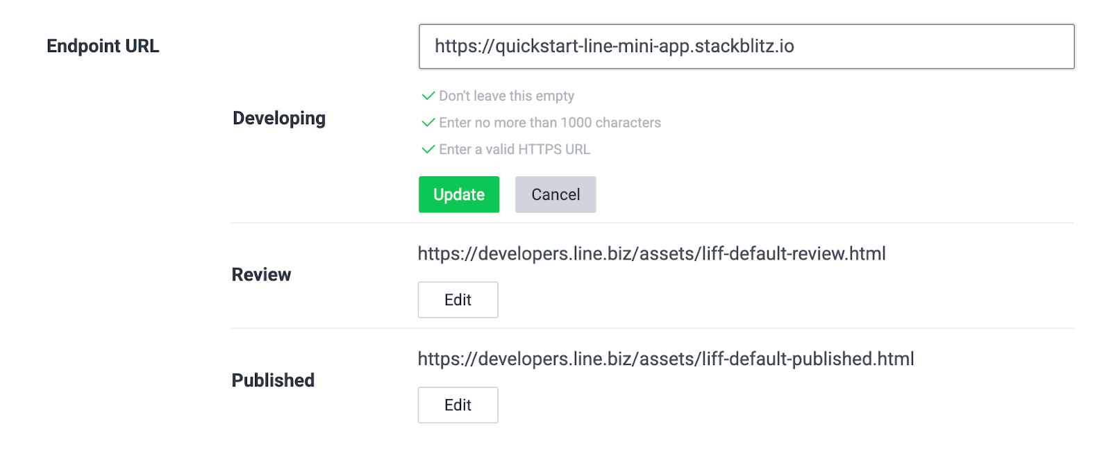 Endpoint URL: URL ที่รองรับ HTTPS ซึ่งใน Codelab นี้ให้คุณระบุ Endpoint URL ของ StackBlitz ที่ได้จากขั้นตอนที่ 2 ลงไปในช่องของ Developing