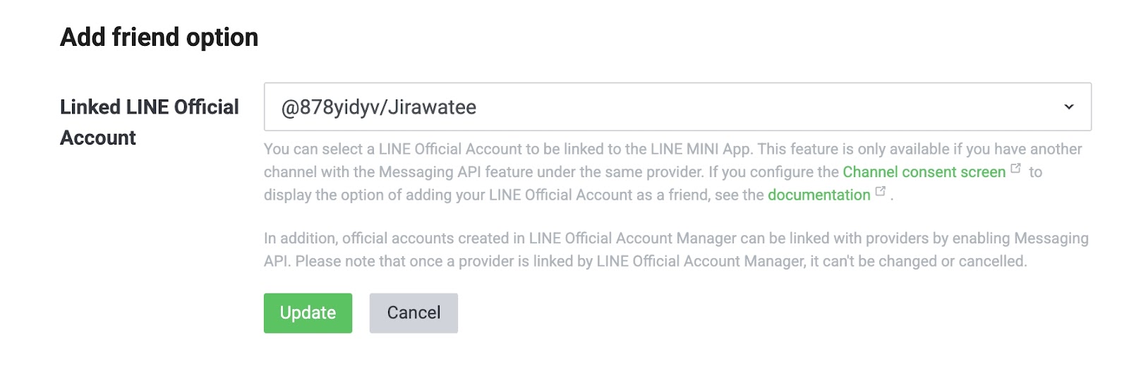 ในการใช้งานบางกรณีเราอาจต้องการให้ LINE MINI App ทำงานร่วมกับ LINE Chatbot เช่น เมื่อซื้อสินค้าผ่าน LINE MINI App เสร็จก็ให้ LINE Chatbot ส่งใบเสร็จยืนยันการซื้อสินค้ากลับไป ซึ่งกรณีนี้เราสามารถเชื่อมต่อทั้งบริการทั้งสองเข้าด้วยกัน เพื่อให้แน่ใจว่าผู้ใช้งาน LINE MINI App ได้เป็นเพื่อนกับ LINE Chatbot เราแล้ว โดยผ่านฟีเจอร์ที่ชื่อ Linked LINE Official Account