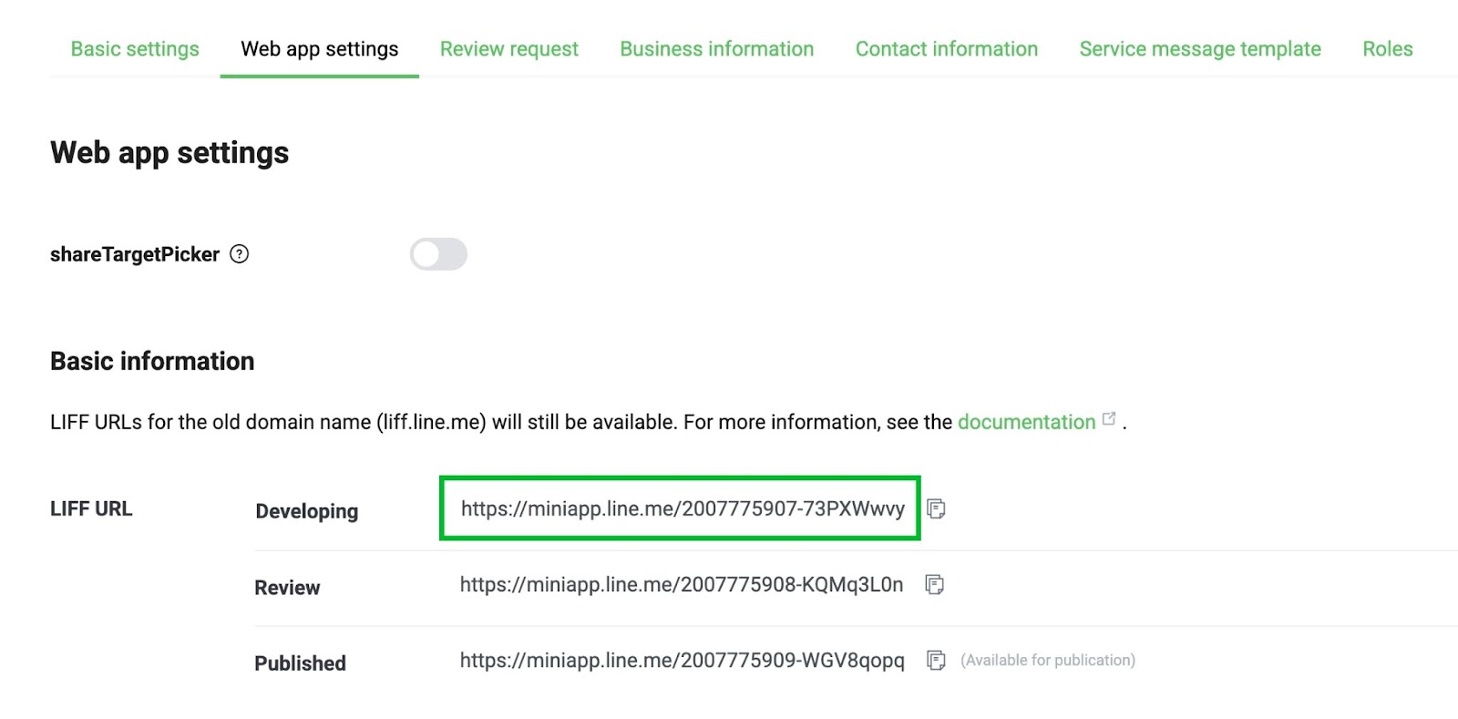 โดย URL ของ LINE MINI App ที่เราจะนำไปใช้จะอยู่ที่ LIFF URL แบบ Developing